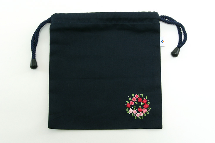 使い勝手や使い心地が良いのはもちろんですが、デザインもとてもお洒落で、なんといっても可愛らしいワンポイントの手刺繍が目をひく巾着小物袋となっています。こちらの刺繍は、プロの刺繍職人さんによってひとつひとつ丁寧に手作業でフラワーの刺繍が施されています。巾着袋全体の生地には黒色の落ち着いたカラーが採用されているため、子供が幼稚園や小学校で使っても汚れが目立つといったことがなく、安心して長くお使い頂けます。黒い生地だからこそ、より赤やピンクのお花の刺繍が栄えて目を引かれる、上品で可愛らしいデザインの巾着袋です。