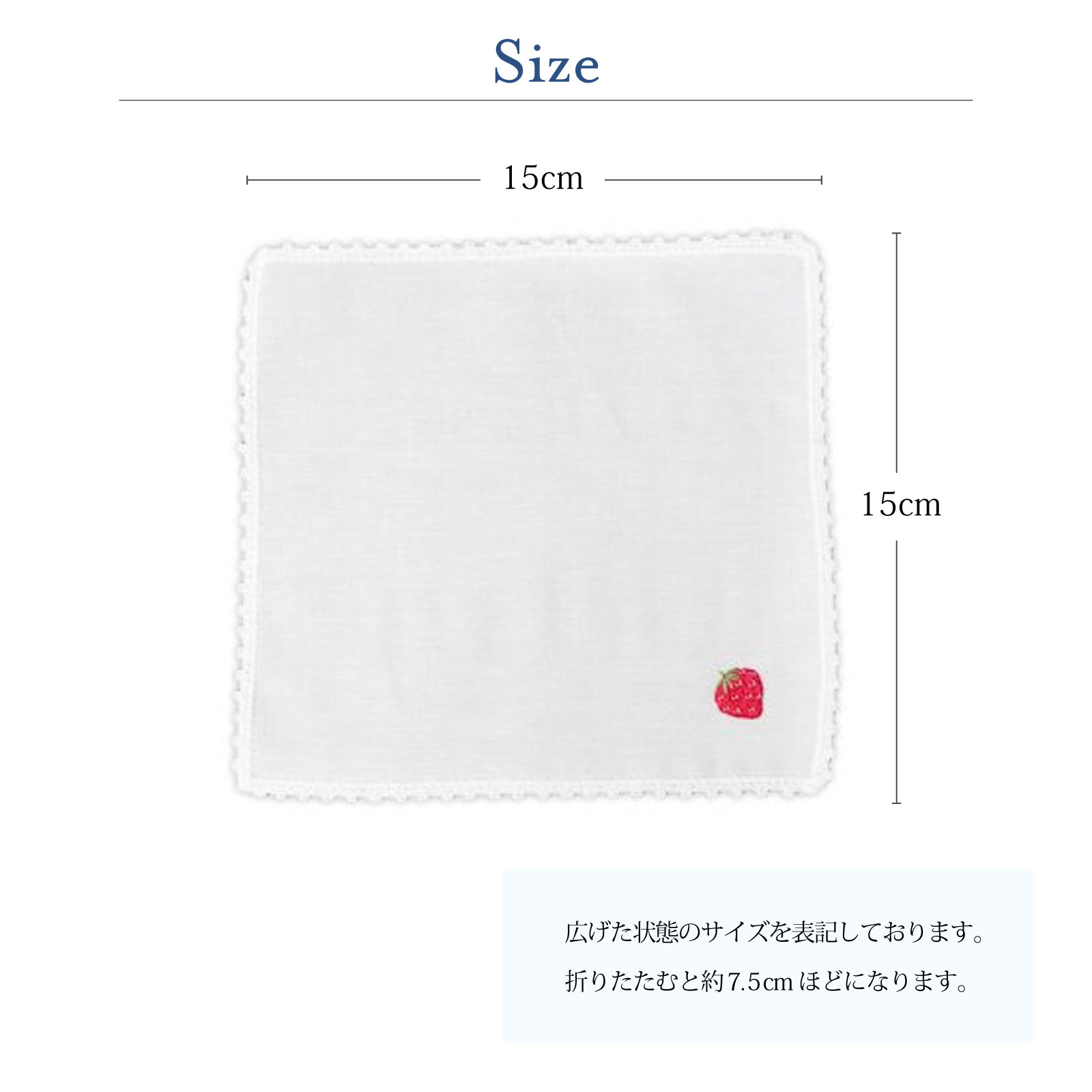 お受験専門店品質 手刺繍 いちご 皺になりにくい ピコレース綿ハンカチ 15cm角サイズ