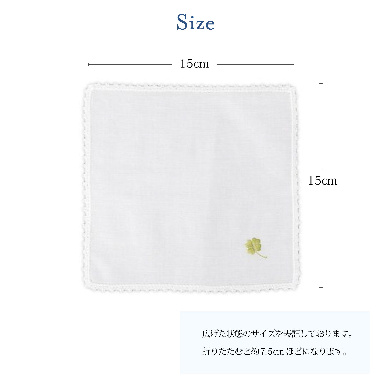 お受験専門店品質 手刺繍 四つ葉のクローバー 皺になりにくい ピコレース綿ハンカチ 15cm角サイズ