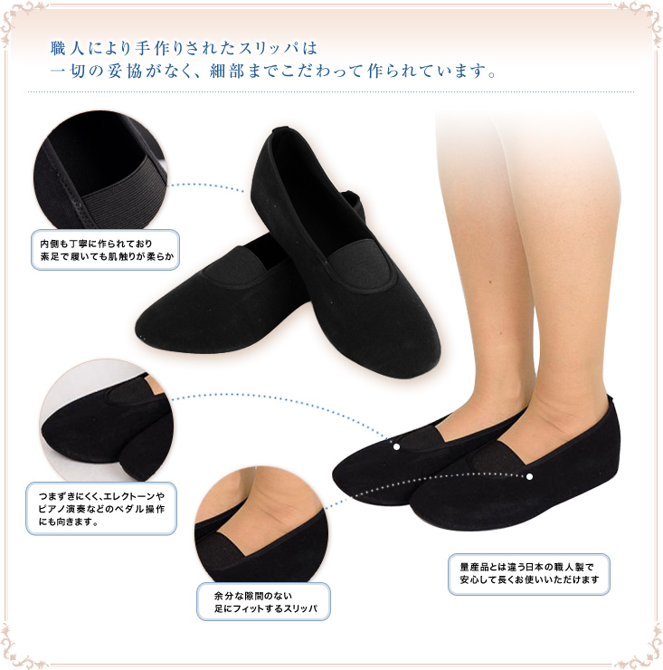 足にピッタリとフィットして脱げ難い女性向けのスリッパです。黒を基調としており、フォーマルな装いに合うため、お受験の服装にも合わせ易くなっています。また、派手な装飾や光沢によるテカリもないため、お受験以外に学校行事や冠婚葬祭といったシーンでもご使用頂けます。サイズは4サイズ用意されており、足の小さな方から大きめの方まで自分にピッタリのものを選ぶことができます。特にお受験の際にお子様と一緒に動き回る場合でもスリッパが脱げて転倒したり、足が疲れてしまうといったことも無くなります。また、段差でも躓き難く、階段の昇り降りでもケガの心配がありません。