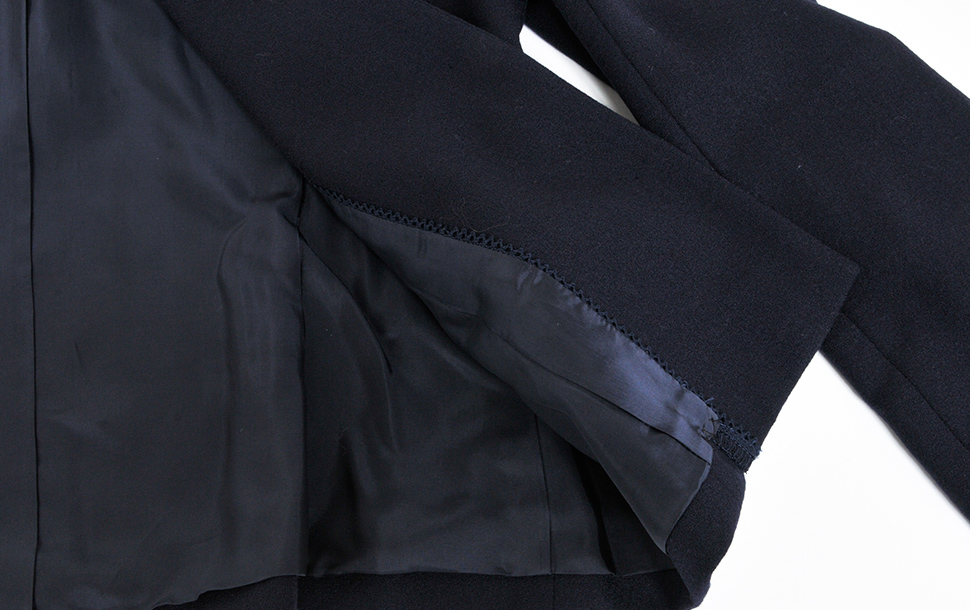 ジャケットの内側見返しには細巾レースを挟み込みおしゃれ感をプラス