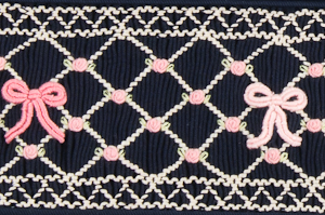 お受験用品のハッピークローバー > 靴袋・スリッパ袋(お子様・ご両親用) > 手刺繍 スモッキング 巾着バッグ 紺色 布製 マチつき リボン柄ピンクB シューズケースやお着替え入れに